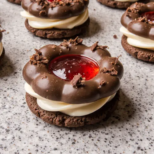 - Consistent Cream Piping: Use a piping bag with a small round tip to pipe the white chocolate cream in a ring on the base cookies. This creates a neat “well” for the cherry jam to sit in, ensuring the filling stays contained and looks professional.