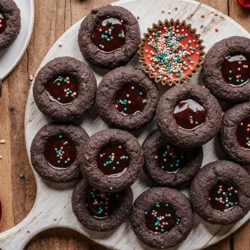 These Chocolate Thumbprint Cookies are versatile and always welcome. They are an ideal cookie for Christmas and holiday platters, where their dark color and festive sprinkles add visual depth. Their elegant, uniform shape makes them excellent for gift boxes and cookie exchanges. Furthermore, they are a fantastic year-round dessert for birthdays, potlucks, or any occasion demanding a dense, satisfying chocolate fix. Because the dough can be chilled for up to three days, you can easily prepare the foundation well in advance of your assembly day, making it convenient for busy schedules.