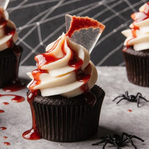 - A Drizzle of Edible Blood: The final, most dramatic touch for these cupcakes is a drizzle of the homemade, edible blood. You can use a spoon or a squeeze bottle to drizzle the blood over the sugar glass shards, creating a realistic and thrilling effect that will impress every guest.