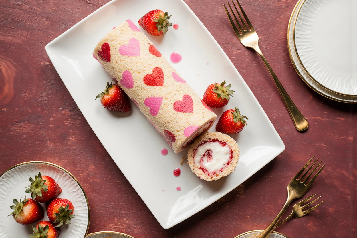 When it comes to Valentine’s Day, a standard box of chocolates just doesn’t cut it anymore. If you really want to show someone you care, you bring out the big guns: a dessert that looks like it took hours of professional training, but was actually made right in your home kitchen. This Strawberry Cake Roll is that showstopper. With its bright red heart pattern baked directly into the light-as-air sponge and a luscious cream cheese and strawberry jam filling, it’s the ultimate edible “I love you.”